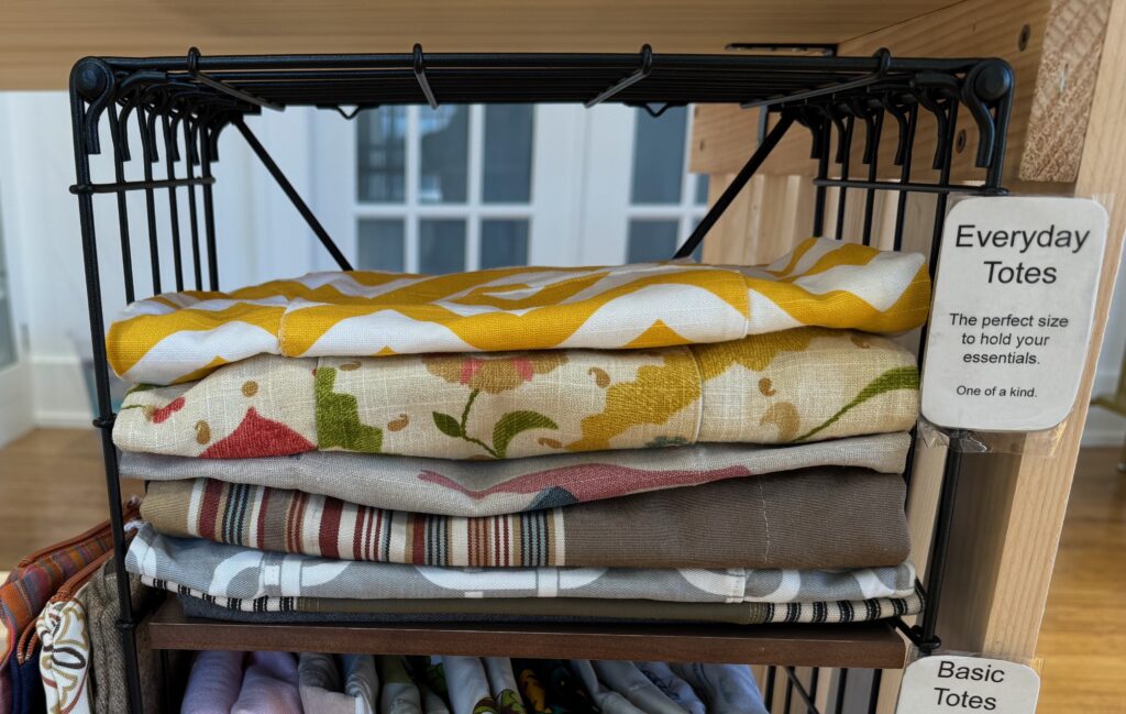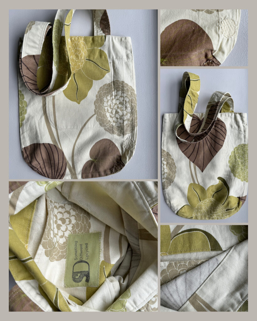 Like all Something Different Upcycled items, Everyday Totes are made from thrifted and/or upcycled sources, such as fabric remnants, table cloths, curtains, and the like.