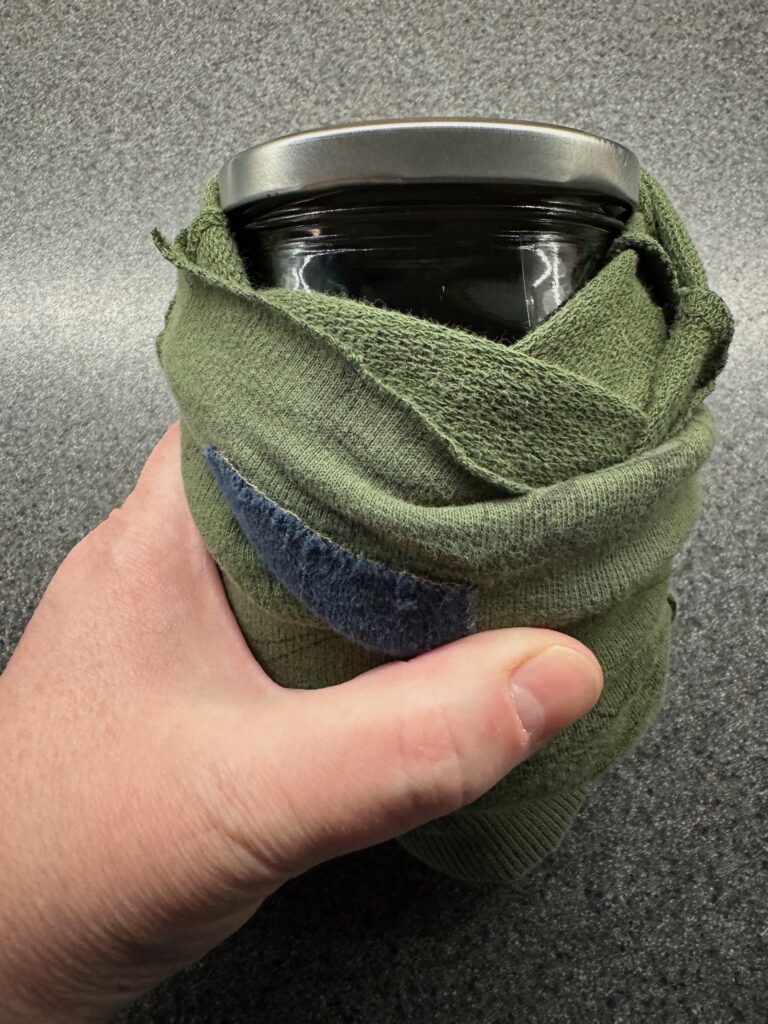 Cut to needed length and tie off for security. Finish the edges if you want. These are easy to remove and washable. If you’re aiming to reduce the noise of lunch containers clinking together, something relatively thin, like a t-shirt sleeve, is probably ok. For bulk shopping, though, pant legs are a better choice. They’ll do a better job of cushioning heavy filled jars. Double up if you like.